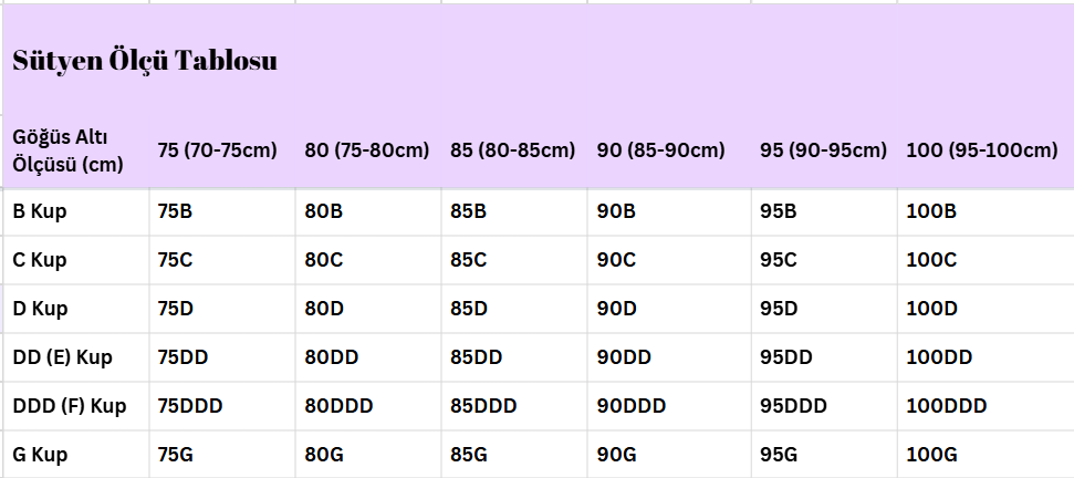 MaynoFit Şekillendirici Sütyen Beden Tablosu